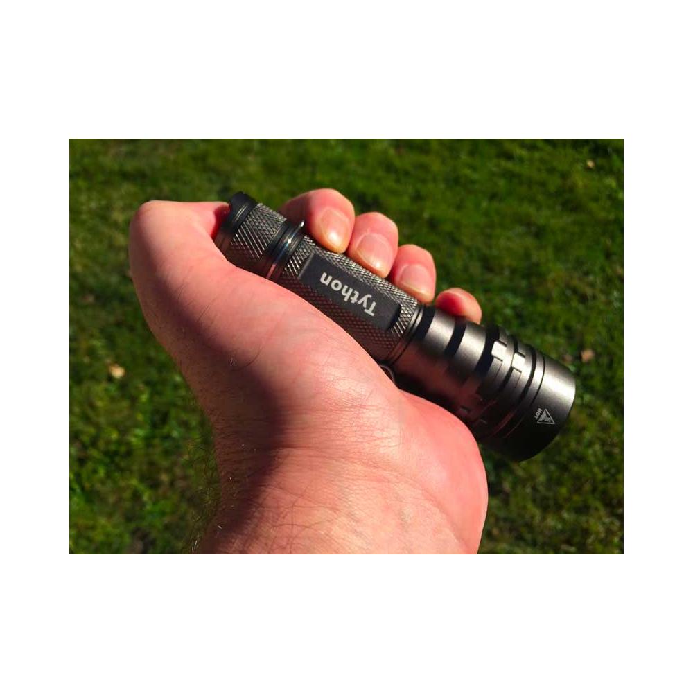 Tython, lampe torche 1600 lumens, portée 450m, autonomie 24h. Robuste, compacte (12cm), 8 modes, interrupteur intelligent.